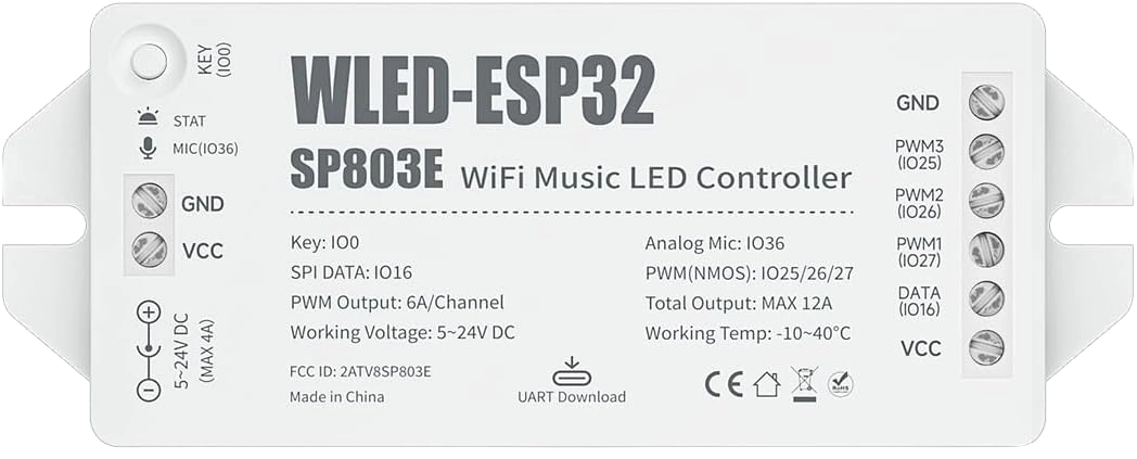 An ESP32 micro-controller running WLED firmware, allowing wireless control of addressable LED strips via Wi-Fi from a web interface or app.